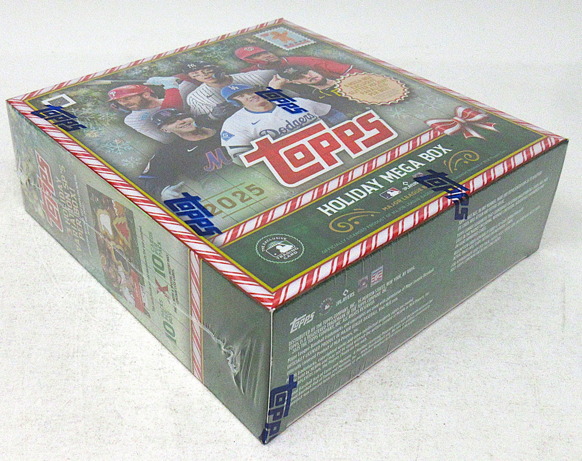 2025 Topps Baseball Mega Box (Holiday) (10/10). This Holiday Mega box contains (10) packs, each with (10) cards. Look for (6) Mega Box Exlusive Glitter Holiday parallel cards per box (on average).
