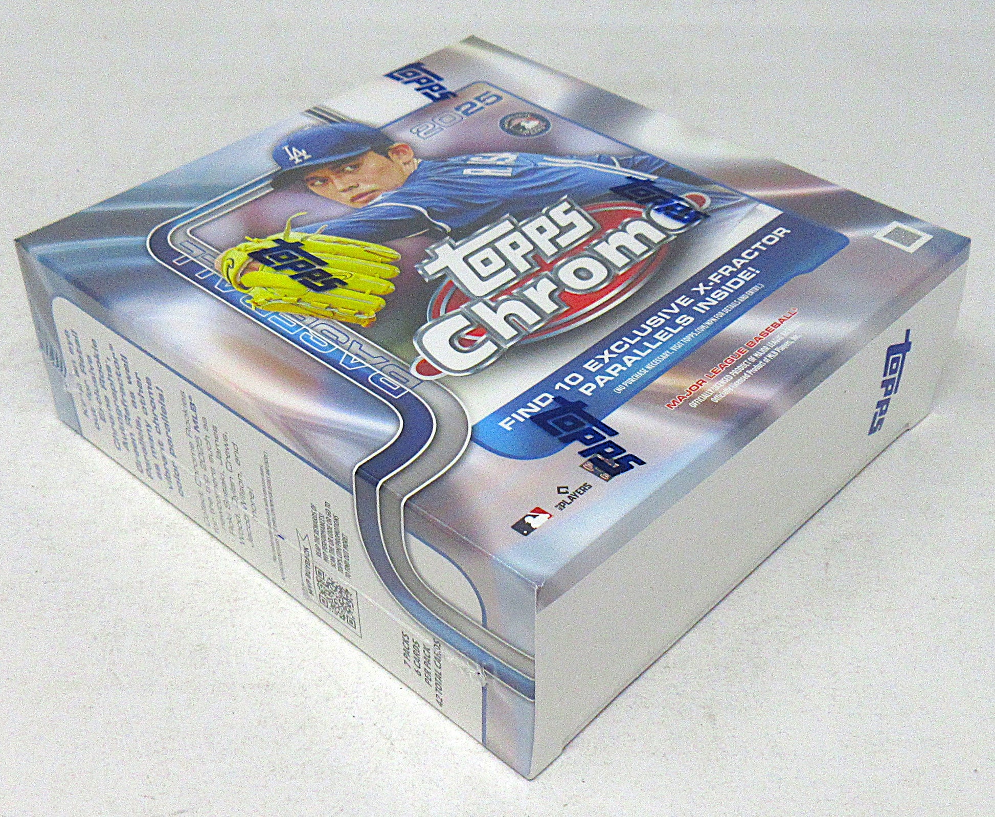 2025 Topps Chrome Baseball Mega Box (7/6). This Mega box contains (7) packs, each with (6) cards. Look for (10) Exclusive X-Fractor parallels per box (on average).