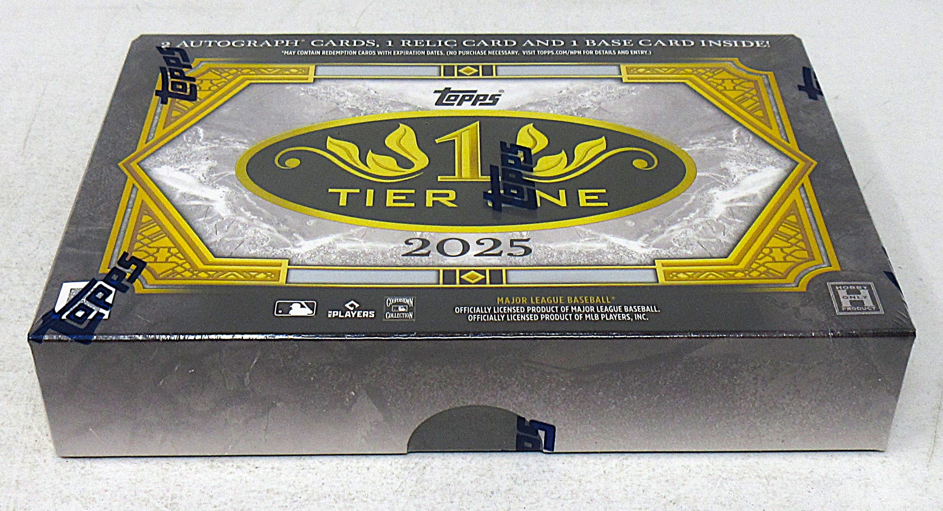 2025 Topps Tier One Baseball Box (Hobby) (1/4). This Hobby box contains (1) Pack with (4) cards. Look for (2) Autographs, (1) Relic card and (1) Base card per box (on average).